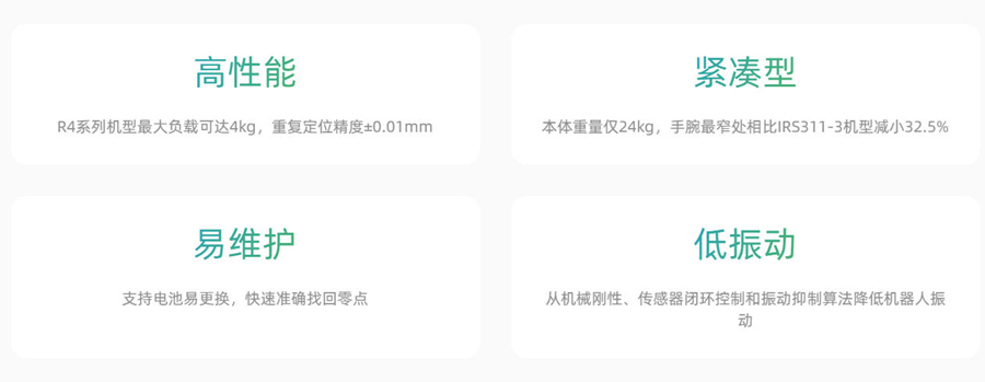 IR-R4系列六关节机器人结构紧凑,结构紧凑,整机高度、结构高度达到行业新水平。应用行业主要分布在3C、锂电、光伏、显示行业,同时满足产品在装配、涂胶的场景应用需求。