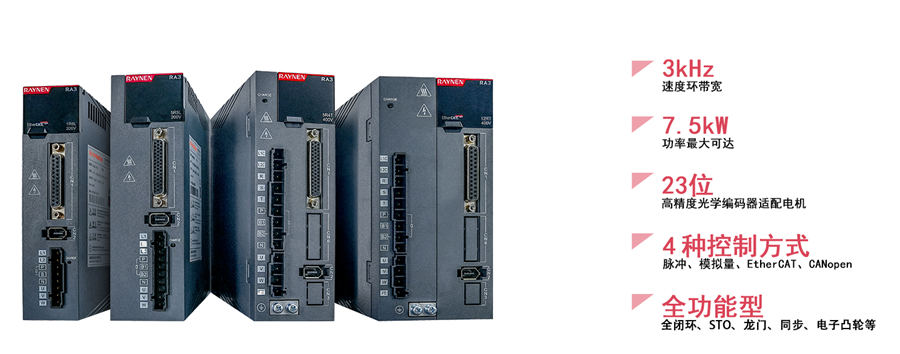 RA3系列全功能型伺服驱动器是睿能科技依托第三代研发技术平台打造的全新伺服产品,具备高精度、高响应、高防护等特点,广泛适用于机器人、锂电、电子设备、纺织、包装、机床和木工等行业,显著提高机械设备生产效率。
